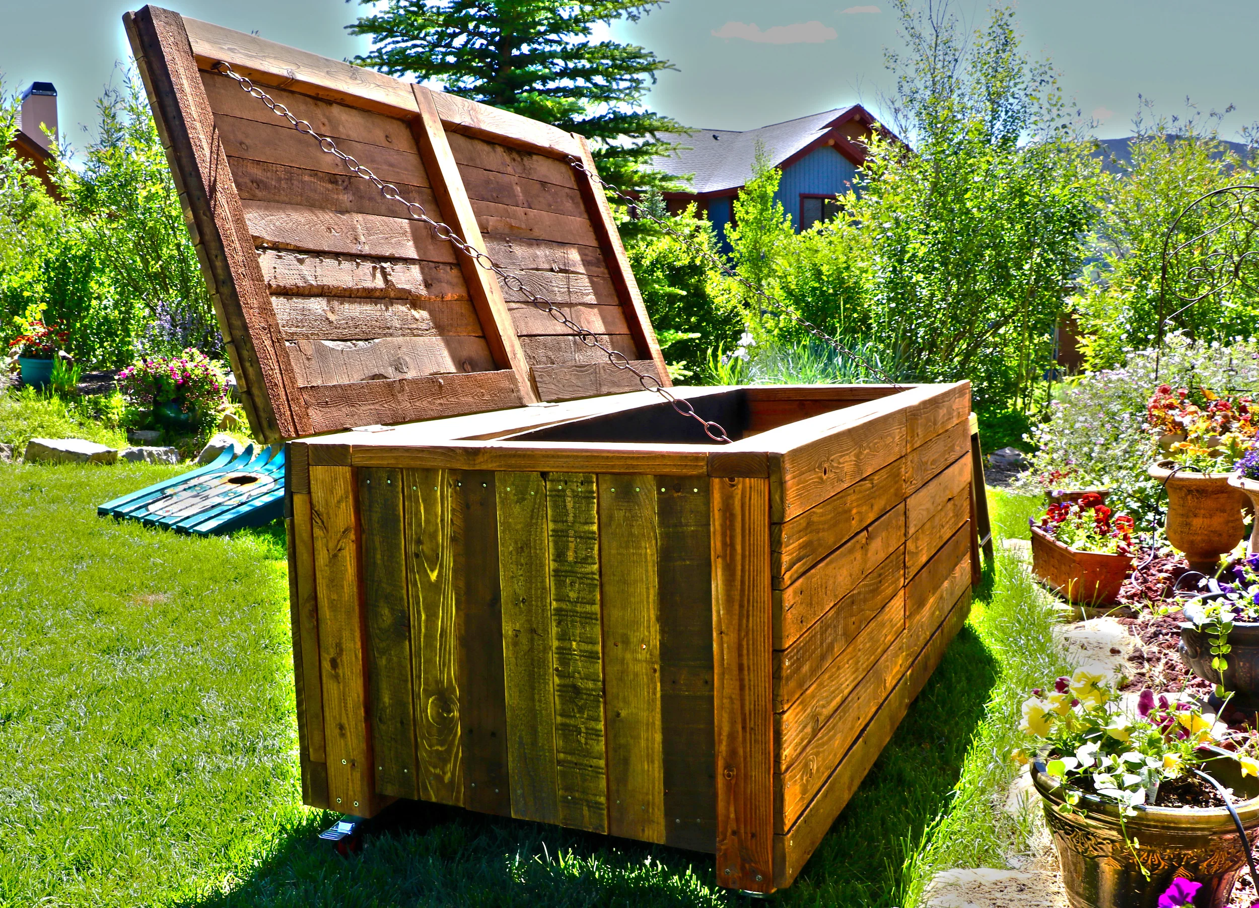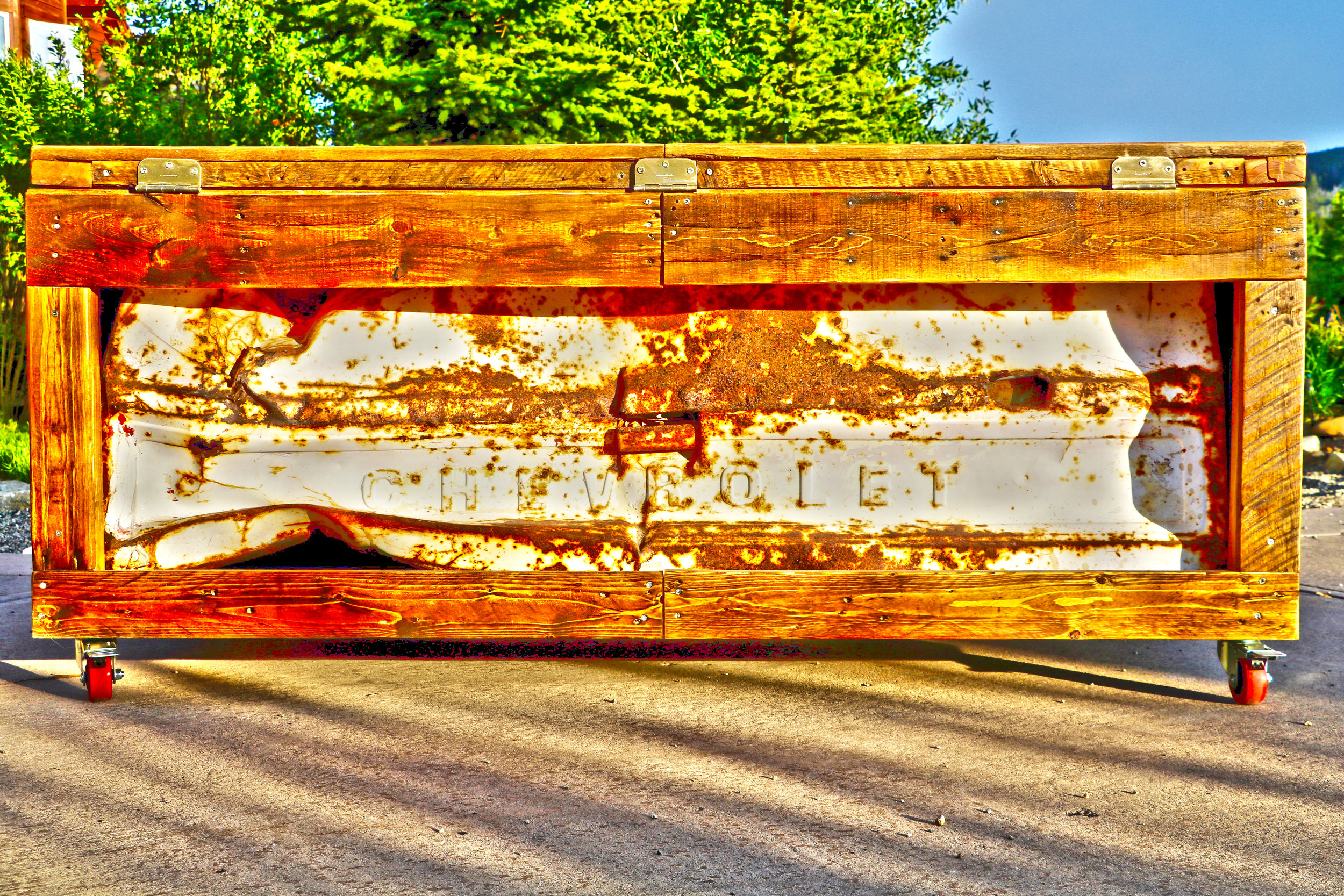 Last fall, a firearm-toting friend and I found a late 50's early 60's Chevy tailgate beat to hell in Colorado's Sheephorn wilderness one day while exploring a few unmarked squiggly lines on my phone's GPS. As we loaded the rusty hunk of metal I said, "Hell yes let's definitely do something with this!" When our high five lowered, it sat outside behind my house for damn near 8 months before the snow had all melted and my mind warmed again. I kept looking at this dented, vintage piece of American history and knew its character, its story, its life full of ups and downs (pardon the pun) had to be displayed as a relic of its time. I tipped a few back and talked up the idea of making it a bench. I framed it out with 2x4's and accounted for the mangled extrusion in the tailgate, but as it grew I began plugging away at the idea of turning it into a large western chest or... table or... giant cooler? Who the hell knows- this could be anything. I got lucky finding a few really old, weathered pallets that broke apart with relative ease leaving mostly unbroken 4ft rips of disheveled pallet gold. To my surprise I was able to salvage nearly 2 entire wood pallets using only a wrecking bar at the time. Those perfectly imperfect boards became the trunk's top hatch and back side. Brushed with a batch of puritan pine wood stain, the 6ft long monster was coming into it's own. When my projects start coming together, they tend to also become extremely heavy. In order to move this deteriorating American muscle I installed 4 red casters with brakes to match the small amount of red factory primer peeping through its aged, chalky white exterior. It also needed a handle to lift the heavy hatch and chains to keep the top hatch ajar, but also to stop it from swinging all the way open and snapping the hinges. What became of this project is something of true value to mimic its pre-existing utility. It's a way to honor and finally rest this gatekeeper of a haggard truck bed driven by what I can imagine as a good ol' steadfast cowboy wandering the western wilderness just as I was one late autumn day. Here's to you, old friend; rest easy knowing that I recycled your beat up Chevy truck bed in the form of a vintage wooden Chevy-inspired trunk. Hopefully one day you can share the story of how in hell that thing ended up all the way out there so I can put my myths to rest. Til then, Cheers.