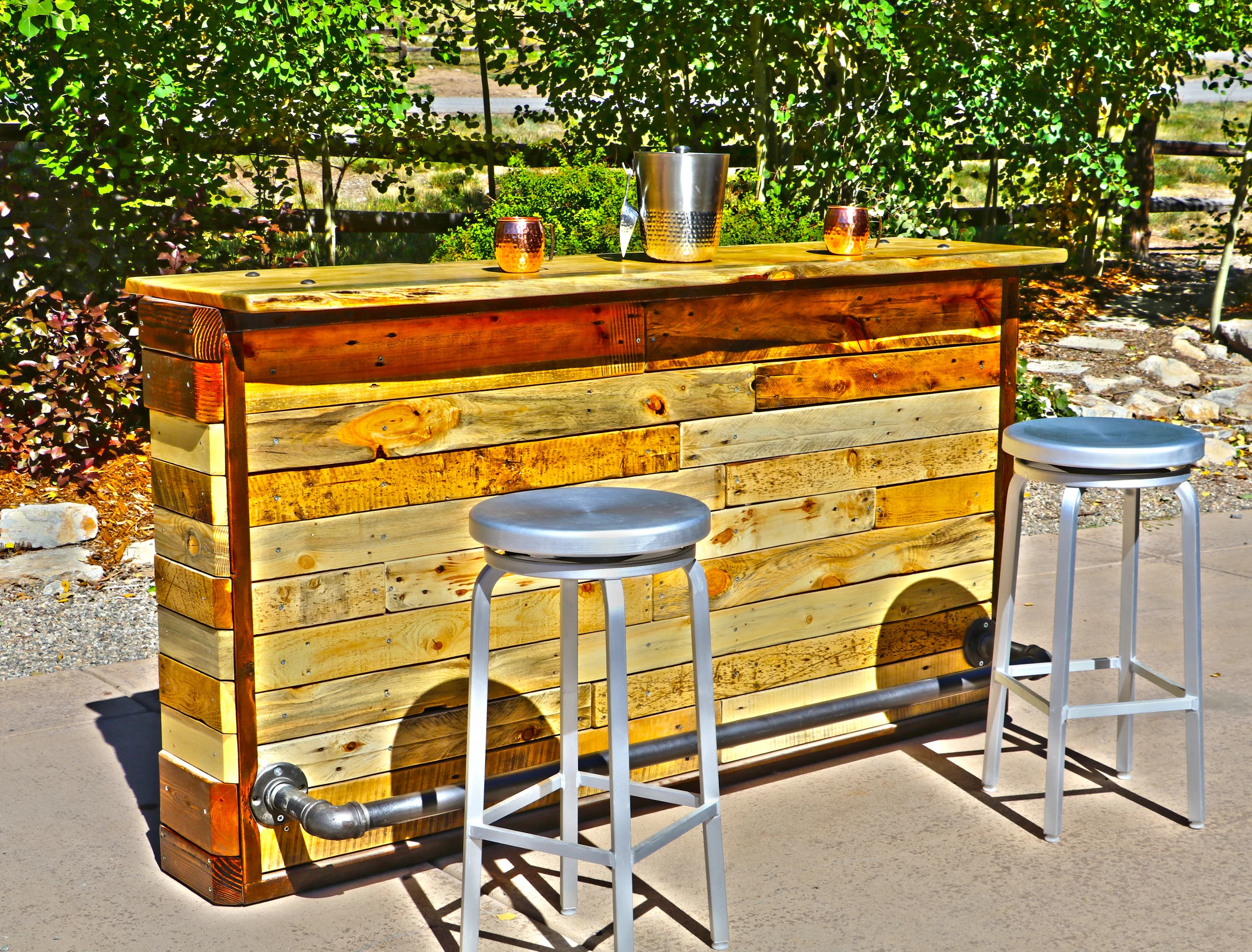 (1) 8ft Blue Stain Pine Bar Top with Black Iron Pipe & Reclaimed Pallet Wood Backboard/Backsplash