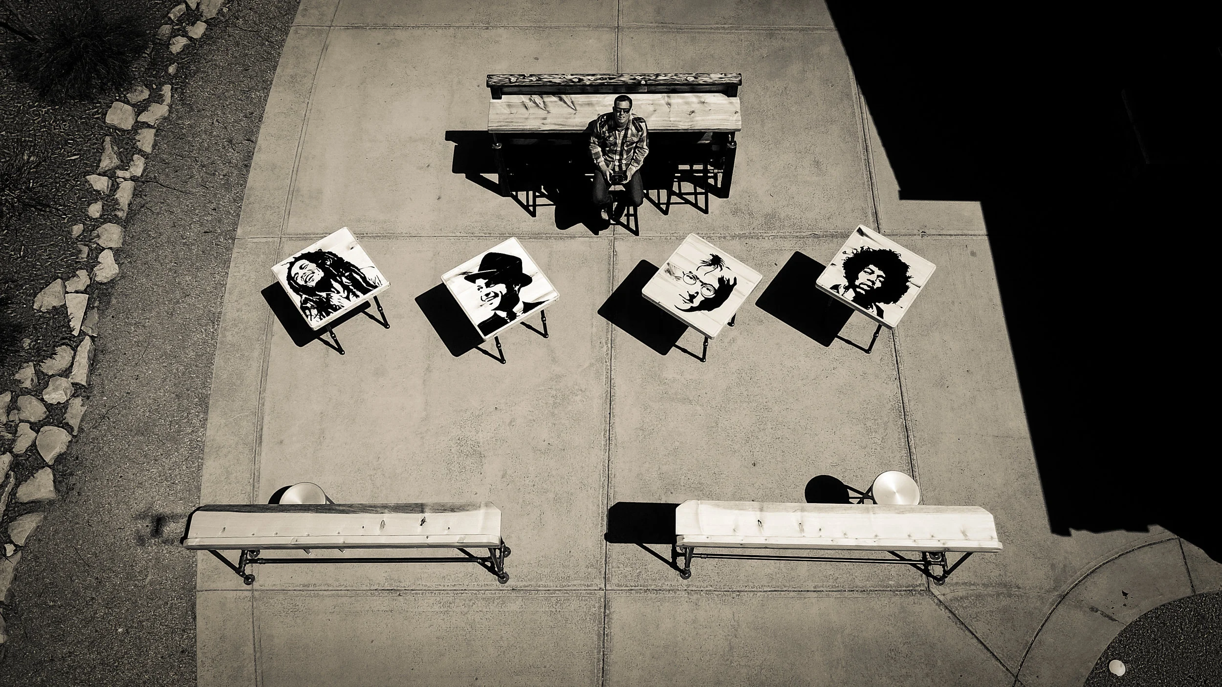 (4) 31.5" x 31.5" Hand-Crafted, Hand-Painted Artist Tables. Aspen Wood & Black Iron Pipe: Jimi Hendrix, John Lennon, Frank Sinatra, Bob Marley