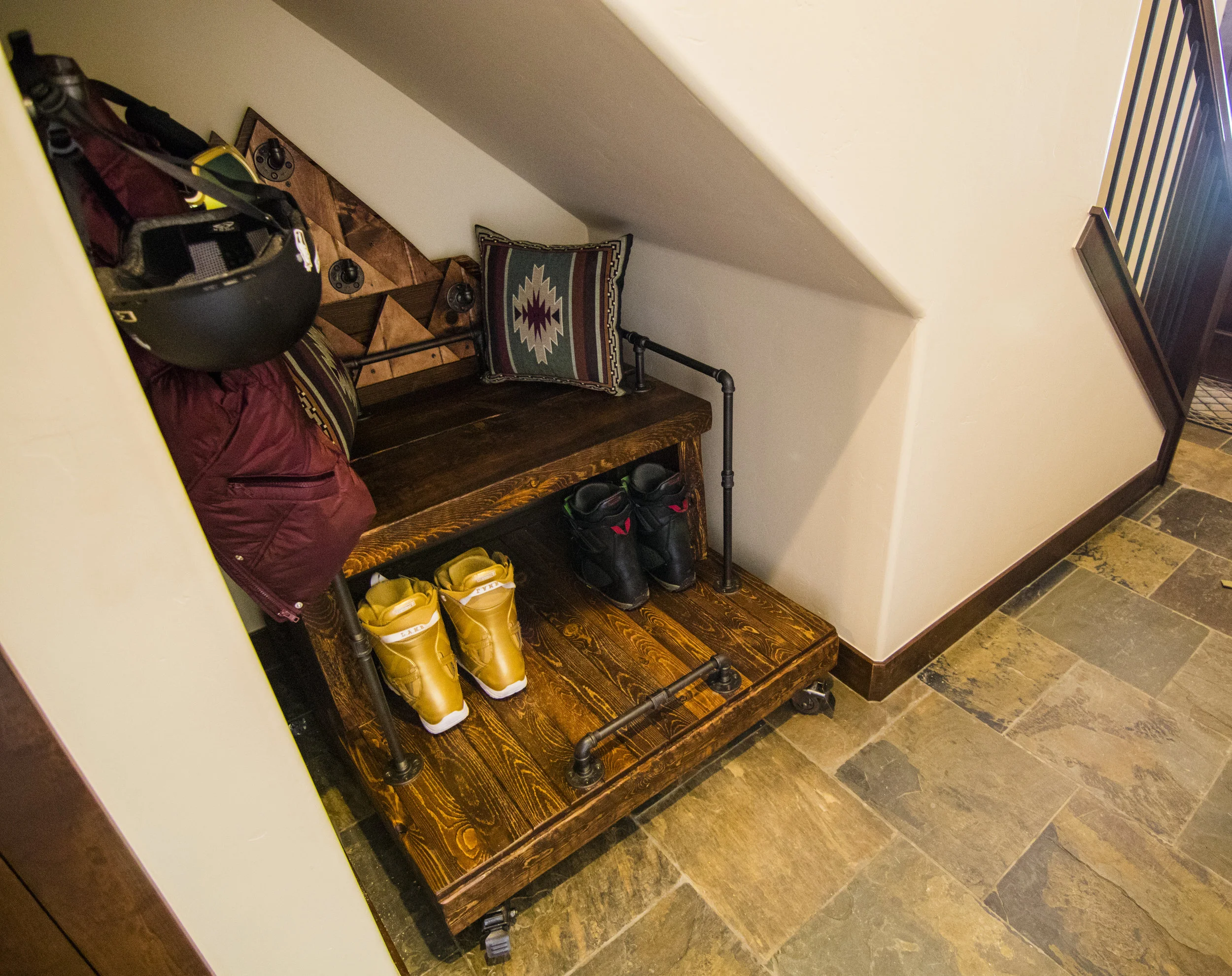 This is the epitome of a custom ski house creation to fit a space underneath a staircase as you walk into the condo from the garage. Wood is blue stain beetle kill pine, stained 50% red oak and 50% golden oak. 40" wide x 40" deep and mountain design backing with hooks for helmets, goggles, gloves, etc. It also features black iron pipe arm rests and pull handles. The piece is sitting on large swivel casters for portability to pull in and out from underneath the staircase.