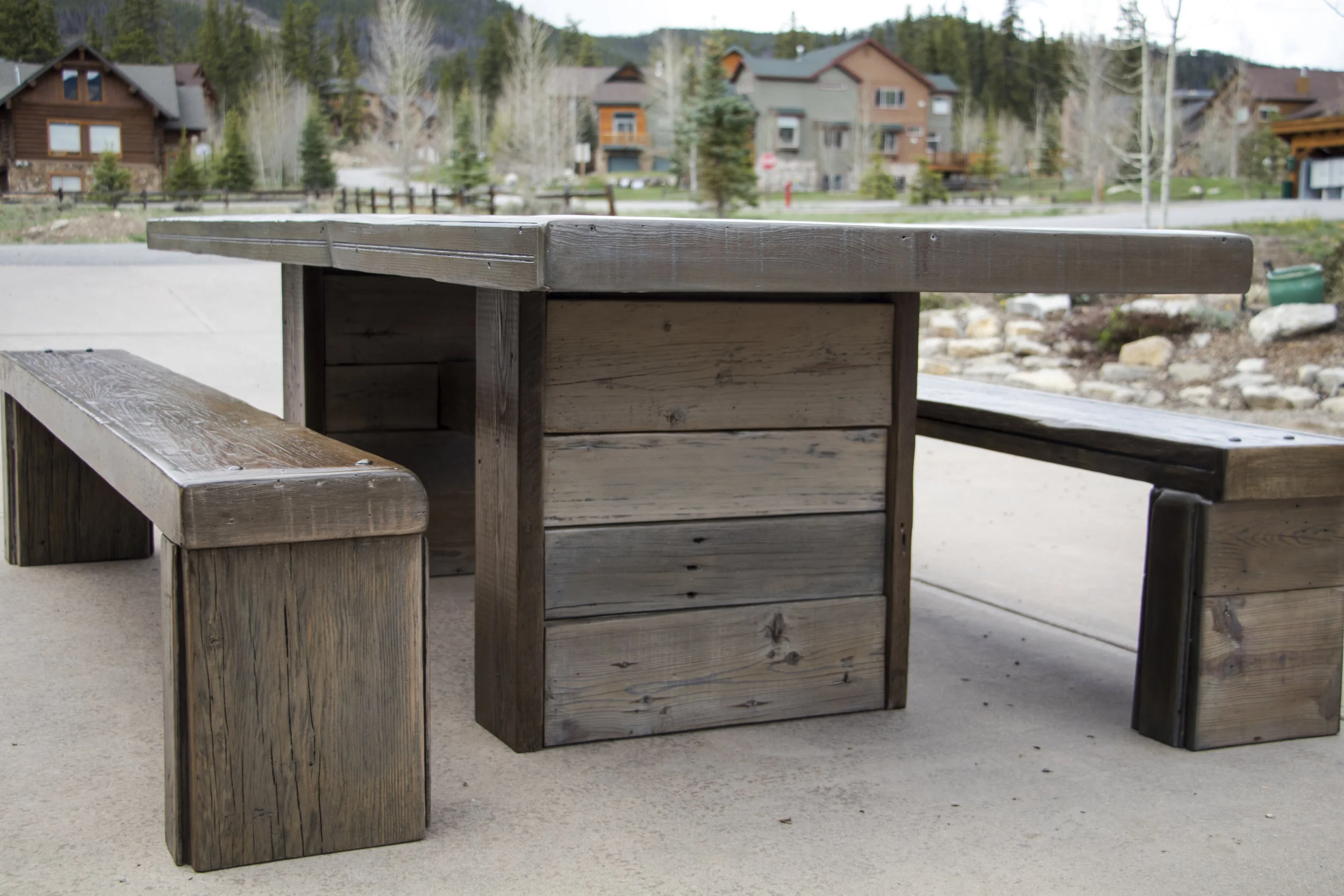 The wood slab is sourced from Pug Ryans Brewery while the vintage wood beam was pulled from the shores of Lake Dillon for the same condo just down the road in Keystone.